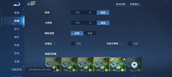 在《王者榮耀》中,我們設(shè)置超高幀率以及超高分辨率,畫質(zhì)則是高清。