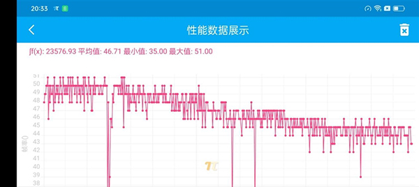 從測試結(jié)果來看,在剛開始時幀率保持在50幀左右,隨著游戲進(jìn)程不斷深入,游戲的幀率也開始趨于穩(wěn)定,最終來到46幀,平均幀率46幀。