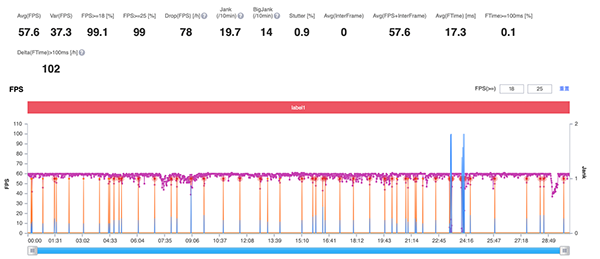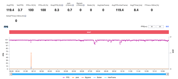 可以看到:王者榮耀和原神的平均幀率分別為119.4幀和57.6幀,幀率波動較小,整體表現(xiàn)不錯。測試時,努比亞Z40 Pro還未適配到90幀和平精英,則先進行60幀測試,平均幀率為59.9幀,整體穩(wěn)如一條直線,足可見努比亞Z40 Pro性能的優(yōu)秀。得益于X軸線性馬達的加持,努比亞Z40 Pro開槍瞬間振動效果明顯,力度反饋適中,體驗不錯。