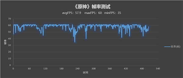 《原神》極高畫質(zhì)下開啟60幀模式,使用固定的測試線路測試。平均幀率可以達到57.9 FPS,不過波動較大,最低為35 FPS。