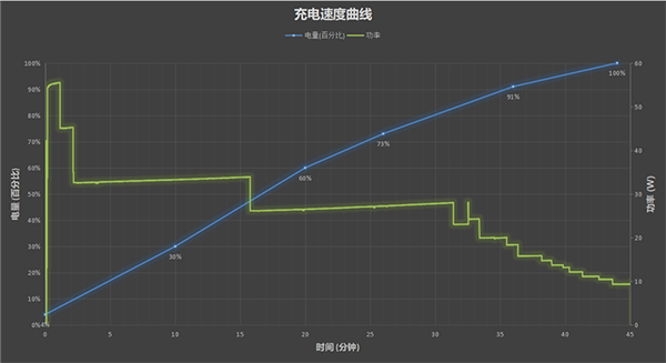 實測需要45分鐘,才可充滿。電量曲線如圖中藍色線條所示,功率曲線如圖中紅色線條所示。