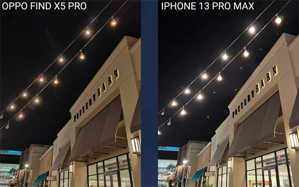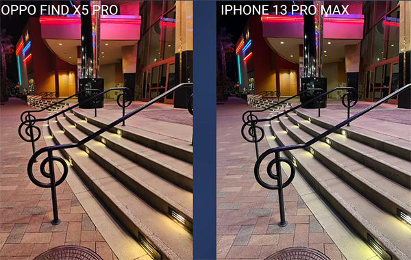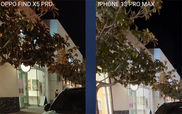 我們拿OPPO Find X5 Pro與iPhone13ProMax做對比,首先是夜景視頻拍攝方面,可以很清楚的看到,左邊OPPO手機對高光的抑制更到位,高光不溢出,暗部細節(jié)也很豐富,并且沒有出現(xiàn)“鬼影”。
