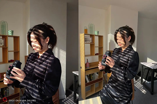這顆6400萬(wàn)像素的主攝在光線條件良好條件下,成像表現(xiàn)優(yōu)異。和iPhone 13 Pro相比,其細(xì)節(jié)表現(xiàn)絲毫都不遜色。并且在面對(duì)高光畫(huà)面時(shí),其內(nèi)置的AI和HDR算法能夠?qū)Τ善?huà)面的光線和色彩進(jìn)行自主調(diào)節(jié)。例如小喻的臉部膚色位置,努比亞Z40 Pro就要相對(duì)自然了不少。