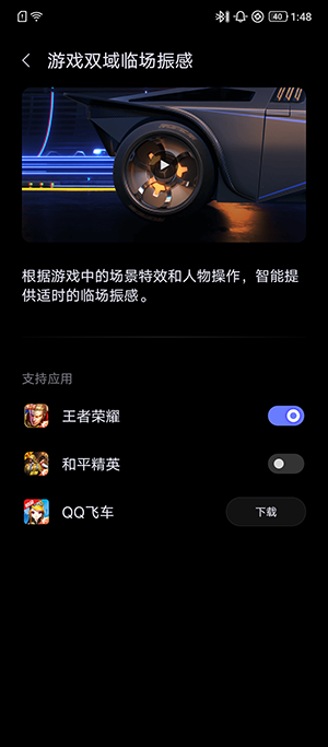 在拯救者助手中,開(kāi)啟“臨場(chǎng)振感”后,游玩《和平精英》中的擊殺、開(kāi)車、碰撞、手雷爆炸等場(chǎng)景更具沉浸感;同時(shí),《QQ 飛車》和《王者榮耀》也已適配該功能。