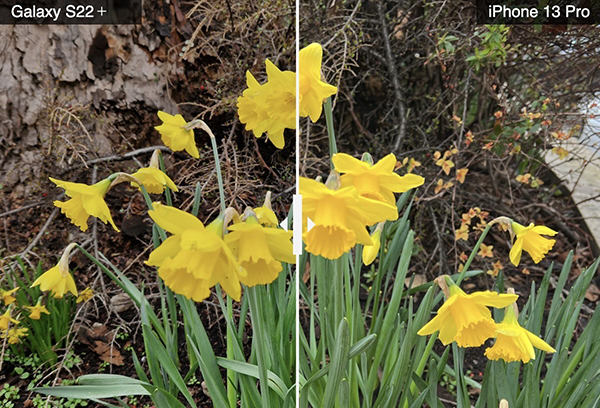 第一組照片是拍攝的喇叭花,乍一看兩款手機(jī)拍攝的照片似乎沒有什么區(qū)別,都非常清晰,不過仔細(xì)來看的話,相比三星Galaxy S22+,iPhone 13 Pro拍出的照片效果更真實(shí)更細(xì)膩。