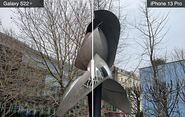 第二張照片是在車站附近拍攝一些公共藝術(shù)作品時(shí),再次出現(xiàn)同樣的結(jié)果,三星Galaxy S22+拍攝的照片色調(diào)更溫暖,亮點(diǎn)不足。iPhone 13 Pro拍攝的照片更逼真,照片也更清亮。