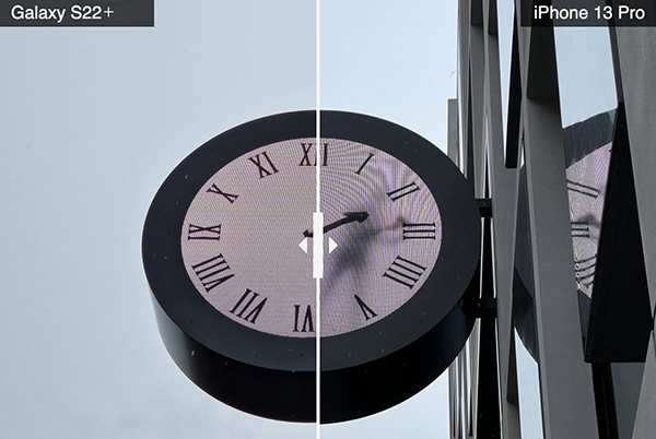 第四組照片是高建筑物上的大鐘,這次兩款手機(jī)都使用了3倍長焦相機(jī),三星Galaxy S22+拍攝的照片色溫差異基本消失了,基本上與蘋果手機(jī)相差無幾。如果說硬要分出個(gè)勝負(fù)的話,我認(rèn)為iPhone 13 Pro拍攝的照片顏色更強(qiáng)烈更清晰,比三星Galaxy S22+更能捕捉鐘體中的數(shù)字和鐘體曲線。
