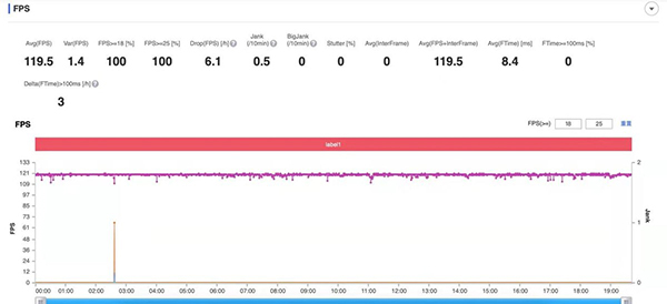 《王者榮耀》最高支持120幀模式,測試一輪游戲平均幀率為119.5fps,基本處于滿幀運(yùn)行。游戲過程中,體感拯救者Y90電競手機(jī)對(duì)操作有很靈敏的感應(yīng)和捕捉,可以靈活打出各種連招操作。