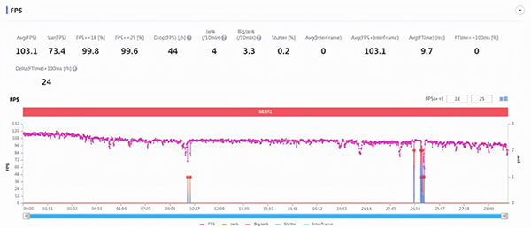 首先,在十分看重流暢性的《和平精英》實測中,OPPO Find X5 Pro開啟90幀模式暢玩半小時,全程游戲幀率均十分穩(wěn)定,平均幀率高達89.3fps,實現(xiàn)幾近滿幀的運行效果。而在另一款熱門手游《王者榮耀》極高幀率模式下,OPPO Find X5 Pro的幀率表現(xiàn)同樣有著相當穩(wěn)定的發(fā)揮,平均幀率達到了103.1fps,整體幀率走勢較為穩(wěn)定,不會出現(xiàn)斷崖式掉幀的情況。