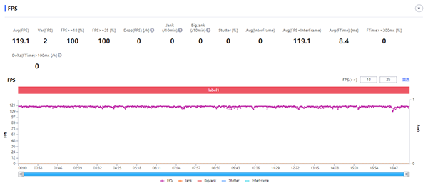 在游戲《王者榮耀》中,我們開啟游戲的120幀模式,其它游戲畫質(zhì)均開啟最高,同時開啟抗鋸齒。在一局正常對局中,OPPO Find X5 Pro保持了驚人的穩(wěn)定性,平均幀率119.1幀,并且?guī)嗜處缀醣3忠粭l直線,即便是在最后團戰(zhàn)環(huán)節(jié),幀率也僅是略有波動,最低也有110幀左右,全程沒有任何卡頓。