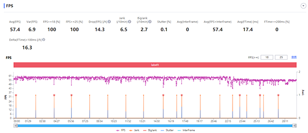 在游戲后期,F(xiàn)ind X5 Pro的幀率有所下降,應該還是系統(tǒng)固件在檢測到手機內(nèi)部的熱量升高之后,對性能做出了一定的限制。但下降幅度并不大,依然保持了較高的幀率水準,并且最低幀與此前保持相近。