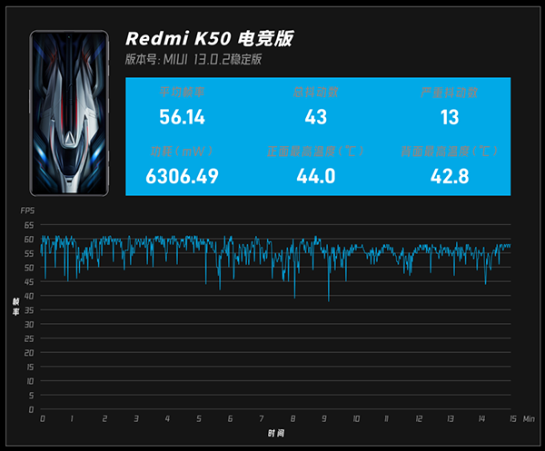 紅米K50電競(jìng)版平均幀率為 56.14 幀,總抖動(dòng)43次,嚴(yán)重抖動(dòng)13次,功耗6.3W,正面最高溫度44.0℃,背面最高溫度42.8℃,可以看到溫度控制得很不錯(cuò)。