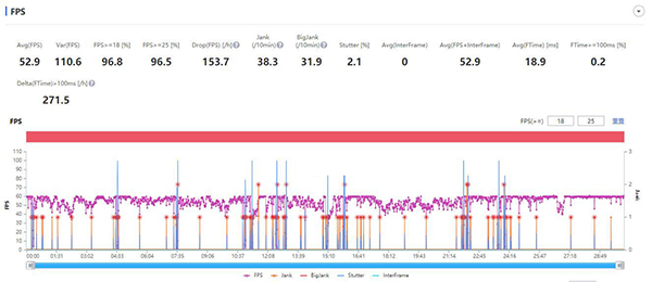 通過(guò)上述幀率圖來(lái)看,游戲整體幀率表現(xiàn)不錯(cuò),隨著時(shí)間的推移及機(jī)身熱量不斷增加,游戲幀率出現(xiàn)小幅波動(dòng),半小時(shí)內(nèi)最終的游戲平均幀率為52.9fps。
