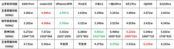 首先看看功耗,S22 Ultra的功耗其實(shí)并不高:王者60Hz的功耗和iQOO 9一樣、原神的功耗和iQOO 9一樣、王者90Hz的功耗和小米12差不多。最大的槽點(diǎn)就是吃雞功耗高,僅次于moto X30。
