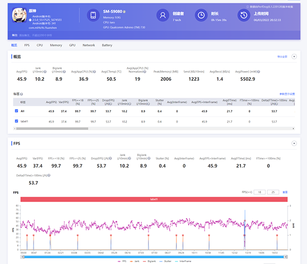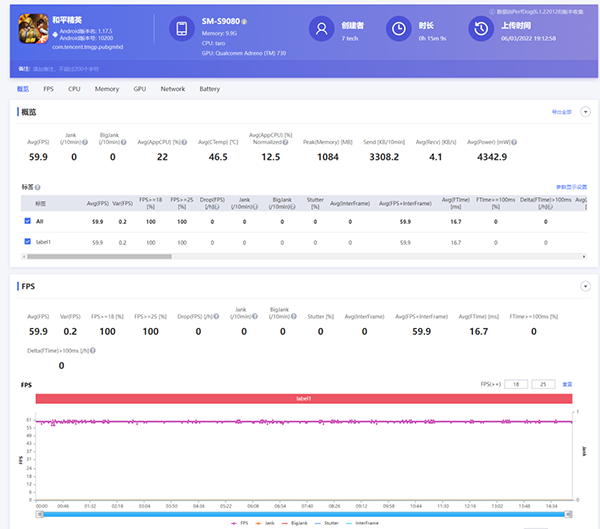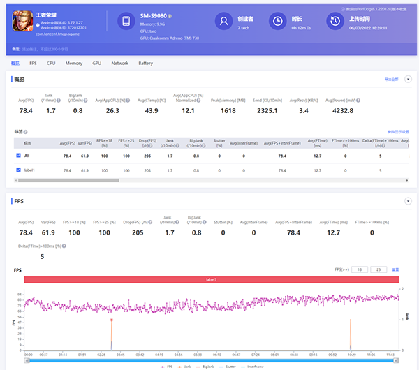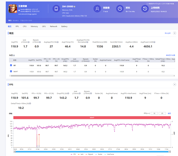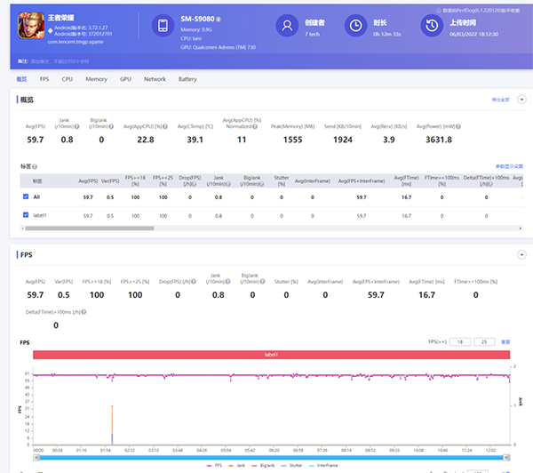 看到幀率變化圖,大家應(yīng)該就明白為什么吃雞功耗高了。因?yàn)镾22 Ultra的吃雞沒有限制性能,全程滿幀率運(yùn)行,所以功耗很高。王者90Hz、原神60Hz都限制了幀率,所以功耗并沒有太高。