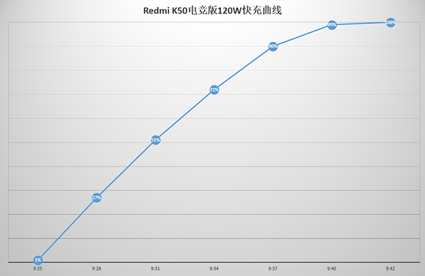 邊充邊玩畢竟是暫時的解決方案,而K50電競版則能在以上場景中也提供較高的快充效率。我們還是從1%的電量開始接上充電器,并且馬上開啟《王者榮耀》游戲,每5分鐘記錄一次當(dāng)前電量,直至手機(jī)充滿電。手機(jī)刷新率保持智能,但因為游戲開啟120fps,所以幾乎是全程120Hz刷新率,亮度為自動、保持Wi-Fi連接。