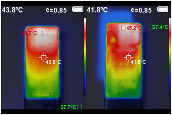 通過溫度檢測數(shù)據(jù)可以看到,在《原神》運行時,CPU的溫度為34℃,在運行15分鐘左右溫度穩(wěn)定在50℃,而反應到機身上,正面的最高溫度為44.7℃,背面溫度最高為45.2℃,在游戲時的整體表現(xiàn)還是非常不錯的。