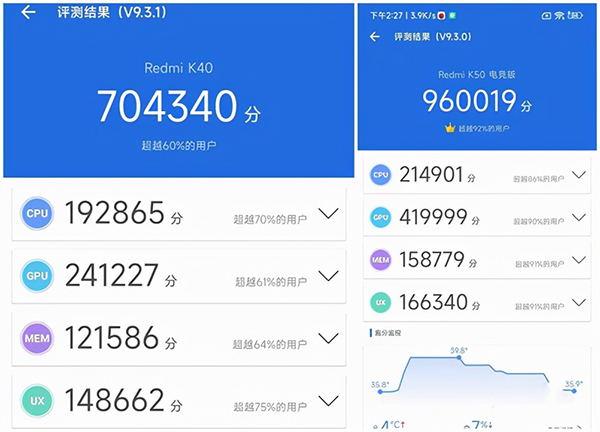 買手機很多人關心的是這個性能,紅米K40搭載的驍龍870相比新一代K50電競版的驍龍8劣勢就比較明顯了,當然,870處理器是一顆相當不錯的處理器,即便是在2022年也能受到各大廠商的青睞。話不多說,先看跑分數據。