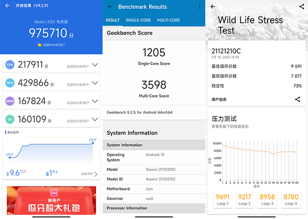 Redmi K50電競版搭載的全新的驍龍8 Gen 1處理器確實是目前安卓陣營最高端的SOC了,這款手機的安兔兔跑分成績是975710,GeekBench 5的單核分數(shù)是1205,多核分數(shù)為3598,性能跑分確實還行,不過在3D Mark的20輪壓力測試下穩(wěn)定性為73%,還是有點踉蹌。
