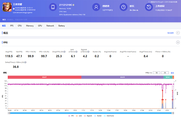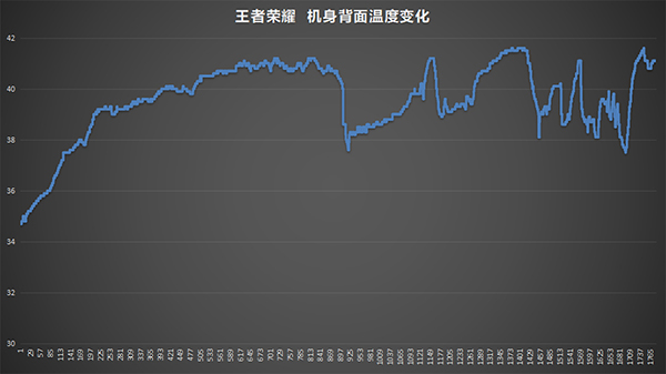 這套散熱系統(tǒng)有沒有發(fā)揮出奇效呢?我們先來看一下《王者榮耀》的幀率和溫度測試結(jié)果,在室溫26℃開啟性能模式的環(huán)境下,30分鐘《王者榮耀》的平均幀率是119.5幀,而且?guī)实牟▌臃群苄。趁孀罡邷厥?1.5℃,靠近攝像頭模組區(qū)域。