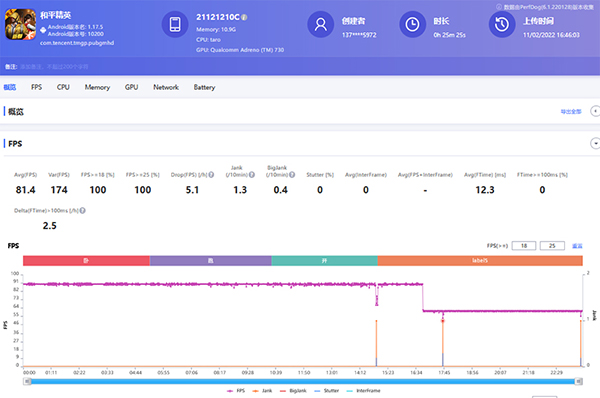 而在25分鐘的和平精英游戲測試中,共進行了2局游戲,第一局進行了15分鐘左右,游戲幀率始終維持在90幀左右,在第二局百人大戰(zhàn)模式下過了2分鐘左右?guī)蕪?0幀降到了60幀左右。機身背面的最高溫度為44.3℃,同樣位于攝像頭附近。