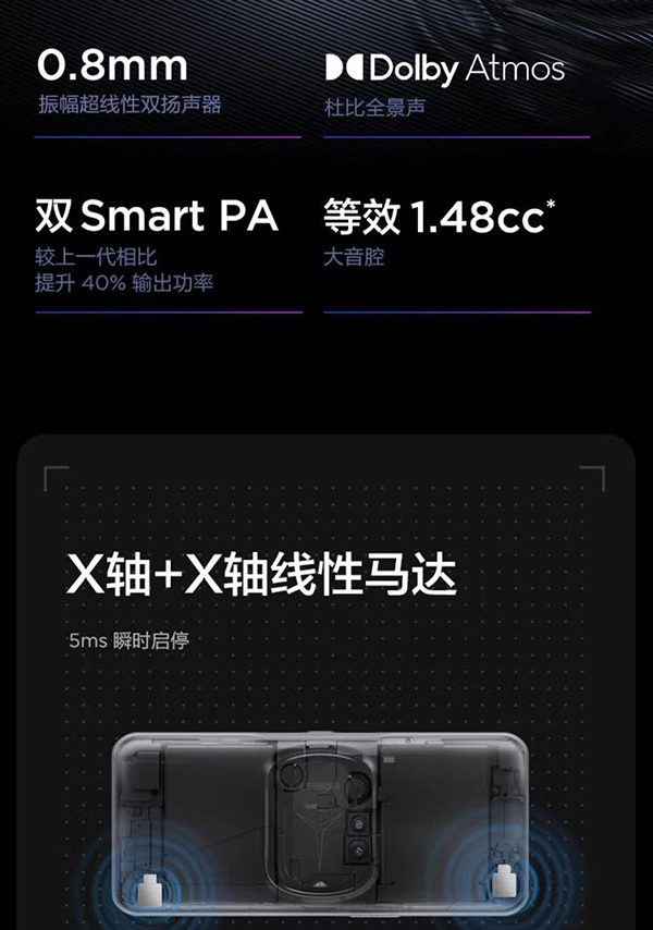 相比市場上一般手機的單X軸馬達設(shè)計,拯救者Y90電競手機繼續(xù)搭載業(yè)界頂級的雙X軸線性馬達方案,穩(wěn)態(tài)震動量提升65%,瞬態(tài)震動量提升120%,有效頻寬上升100%。同時采用雙正出音的0.8mm振幅超線性雙揚聲器,較上代相比,提升40%輸出功率,等效音腔1.48cc。在DOLBY ATOMS DAX 3.7技術(shù)的加持下做到了從內(nèi)容到解碼到音效的全程優(yōu)化。