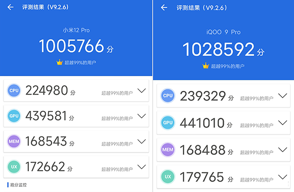 在這樣的高配硬件下,小米12 Pro和iQOO 9 Pro都獲得了超百萬(wàn)的跑分成績(jī),前者得到100萬(wàn)+,后者得到102萬(wàn)+,較于主流旗艦手機(jī)擁有更出色的整機(jī)性能。