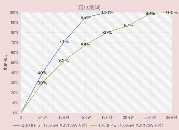 就如今手機市場而言,能上百瓦快充的機型并不多見,所以小米12 Pro和iQOO 9 Pro已是毋庸置疑的人生贏家。根據(jù)統(tǒng)計到的充電實測數(shù)據(jù),像前者恒溫模式下,做到26分鐘充滿手機電量;后者僅需18分鐘就能充電100%,這樣的充電速度相信誰都沒法拒絕,可以快速消除高頻用機時代下的電量焦慮。而了解小米12 Pro的朋友估計知道,該機還支持百瓦疾速模式,18-19分鐘就能充滿手機電量,跟iQOO 9 Pro充電時長接近,過程中可能存在發(fā)熱問題,沒法完全避免。