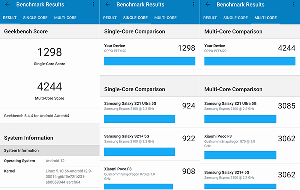 和以往一樣,我們依舊選擇安兔兔和GeekBench5兩款軟件來對OPPO Find X5 Pro天璣版進(jìn)行測試,為了更接近真實使用場景,測試環(huán)境均為室溫條件。實測,它的安兔兔成績?yōu)?91506分,Geenbench5單核1298分,多核4244分。