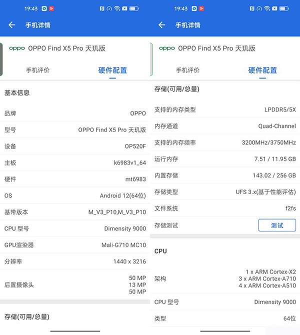 并且值得一提的是,目前Find X5 Pro天璣版有且只有12+256GB這一種存儲配置。同時,雖然安兔兔評測給出的信息顯示,天璣9000可以支持LPDDR5-6400或LPDDR5X-7500兩種規(guī)格的內(nèi)存,但從OPPO官方公布的信息中顯示,F(xiàn)ind X5 Pro天璣版使用的應(yīng)該還是LPDDR5方案。