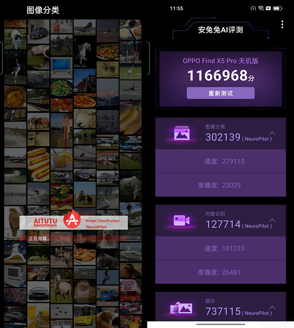 接下來,我們使用安兔兔AI評測對天璣9000的AI性能進行了考察。Find X5 Pro天璣版在這個項目中獲得了超過116萬分的成績,對比這一成績榜上天璣1200的分數(shù)(70萬分),這也意味著天璣9000的AI實測性能相比之下有著高達65%的提升。