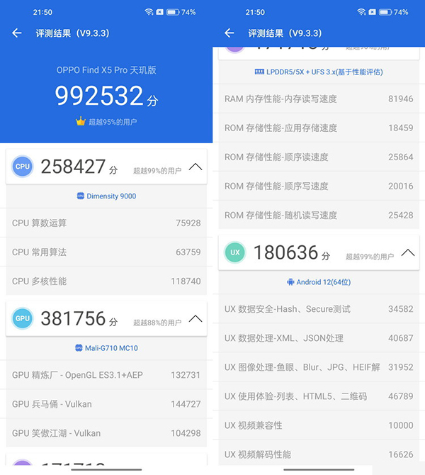 最后,在安兔兔評測的綜合跑分項目中,我們手頭這臺12+256GB的Find X5 Pro天璣版得到了992532的總成績。其中,CPU和UX項目的表現(xiàn)非常突出,均超越了99%的用戶,而GPU子項和內(nèi)存子項則分別超越了88%與90%的用戶。