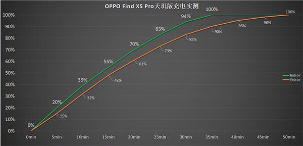 這個充電表現(xiàn)意味著用Find X5 Pro天璣版,上班使用一天回家,基本上吃頓晚飯的時間,手機就能滿血復活。80W的有線閃充雖然從參數上看不占優(yōu)勢,但是能在35分鐘左右充滿5000毫安時的大電池,充電速度已經足以滿足大多數人群的充電需求了。