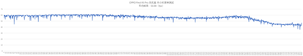 最后是《原神》,手機(jī)設(shè)置為高性能+電競模式+極限穩(wěn)幀,原神內(nèi)則開啟最高畫質(zhì)+TAA抗鋸齒,在室溫25°C的情況下,進(jìn)行時(shí)長半小時(shí)的試玩。從幀率監(jiān)測曲線圖來看,整局游戲下來,OPPO Find X5 Pro天璣版的平均幀率可以達(dá)到56幀左右,并且除了后一小段幀數(shù)出現(xiàn)一個(gè)小幅度的平滑降幀以外,大部分時(shí)間都保持在一個(gè)平穩(wěn)的狀態(tài);而且其最高溫度也能控制在44.5°C,處于體感可接受范圍之內(nèi),整體游戲體驗(yàn)還是可圈可點(diǎn)的。