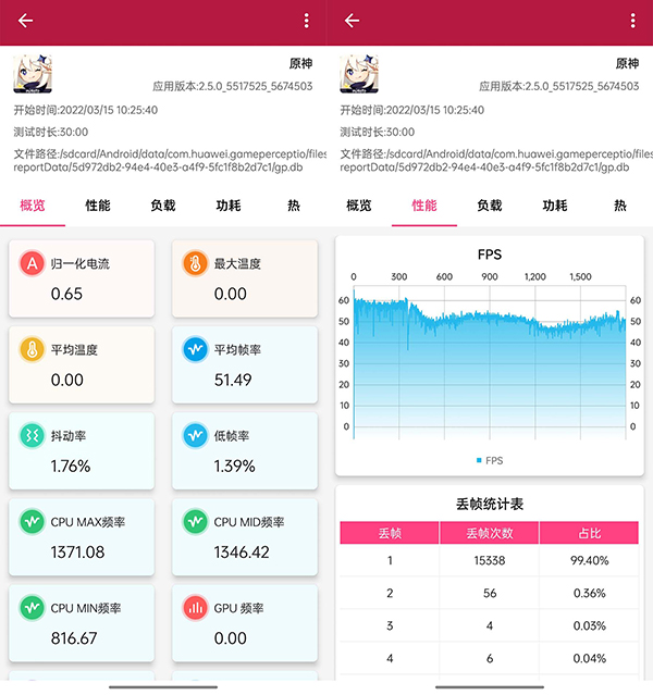 最后則是重點(diǎn)游戲《原神》,適當(dāng)調(diào)整畫面質(zhì)量后,OPPO Find X5 Pro天璣版運(yùn)行半小時(shí)游戲幀率表現(xiàn)十分不錯(cuò),而且全程沒有使用任何的輔助散熱手段,平均幀率達(dá)到了51.49。從幀率曲線可以見到,游戲運(yùn)行到一定時(shí)間后會(huì)出現(xiàn)一些幀數(shù)上的浮動(dòng),但考慮到《原神》對(duì)性能要求之高,個(gè)人認(rèn)為天璣9000的發(fā)揮還是比較平穩(wěn)的。