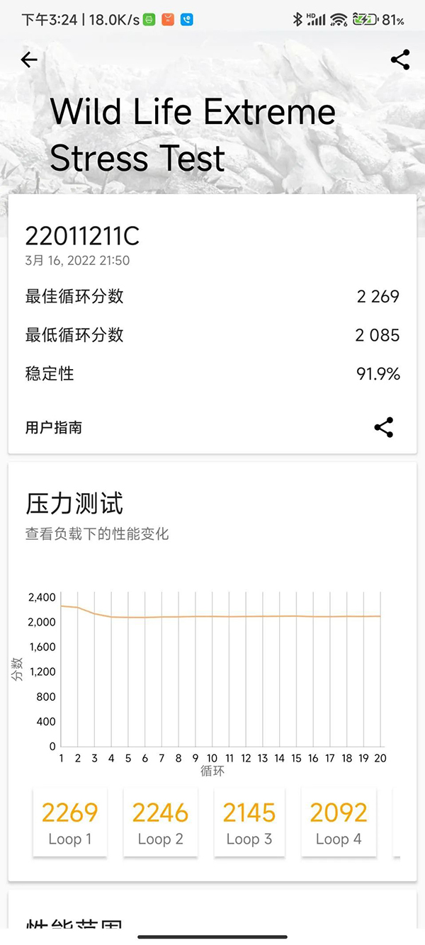 在3DMark WildLife ExtremeStress測試中,最佳循環(huán)分數(shù)為2269,穩(wěn)定性為91.9%。