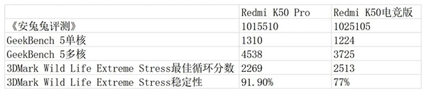 在綜合性能測試App《安兔兔評測》中,Redmi K50 Pro得分為1015510;在針對CPU表現(xiàn)的GeekBench5.1中,其CPU單核成績?yōu)?310,多核成績?yōu)?538;在3DMark WildLife ExtremeStress測試中,最佳循環(huán)分數(shù)為2269,穩(wěn)定性為91.9%。