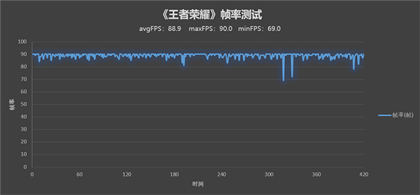 《王者榮耀》僅支持最高畫質(zhì)90幀模式,測試幀率曲線非常穩(wěn),平均幀率為88.9 FPS。