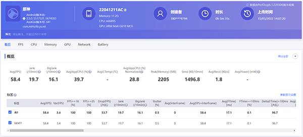 在五分鐘的Perfdog統(tǒng)計數(shù)據(jù)中,紅米K50運行的平均幀率超過了58fps,同時幀率抖動為19.7%,嚴(yán)重卡頓為16.1%,盡管嚴(yán)重卡頓的比率算不上出色,但實際感官體驗來說似乎并沒有那么夸張,在戰(zhàn)斗場景中的視角高速挪動并沒有帶來明顯的卡頓不適,也就是說,這個數(shù)字僅僅只能作為參考,而實際體驗上,紅米K50的性能表現(xiàn)絲毫不遜于既往驍龍888平臺的表現(xiàn),甚至還要好一點。