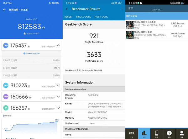 首先測試的是紅米K50的理論性能跑分,基于天璣8100的紅米K50 兔兔跑分超81W分,GB5單核921分,多核3633分,GFX ES3.1 112fps,ES 3.0 169fps,功耗在6W左右。