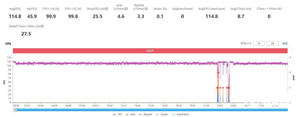 這里我們直接來(lái)看實(shí)際游戲的表現(xiàn),首先是中等負(fù)載的《王者榮耀》,測(cè)試環(huán)境室溫25度,游戲開(kāi)啟極限幀率、超高分辨率、高清畫(huà)質(zhì),并開(kāi)啟抗鋸齒。30分鐘游戲平均幀率114.8幀,整體運(yùn)行非常穩(wěn)定,幀率曲線(xiàn)在110-120幀之間極小幅度的進(jìn)行波動(dòng),視覺(jué)上的卡頓是肯定沒(méi)有的。溫度控制不錯(cuò),機(jī)身表面最高溫度42.8度。