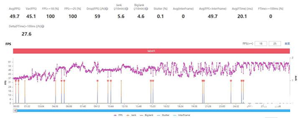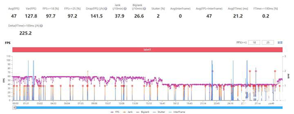 高負(fù)載的游戲《原神》,同樣在25度的環(huán)境中進(jìn)行測(cè)試,游戲中開(kāi)啟極高畫(huà)質(zhì),開(kāi)啟60幀運(yùn)行模式。30分鐘高負(fù)載游戲(非單純跑圖,正常高負(fù)載游戲)平均幀率47幀,是非常不錯(cuò)的幀率表現(xiàn),在同等環(huán)境下的有些新旗艦機(jī)型,平均幀率還到不了40幀。