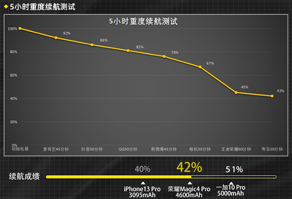經(jīng)過實(shí)際的測試體驗(yàn),榮耀Magic4 Pro的續(xù)航能力還是非常強(qiáng)悍的,對日常電量優(yōu)化的十分出色。在經(jīng)歷了5小時的重度續(xù)航測試后,機(jī)身電池仍剩余了42%的電量,在游戲測試時消耗的電量最高,其余測試項(xiàng)均在正常范圍內(nèi),在淘寶瀏覽測試項(xiàng)目中,表現(xiàn)的最為出色??傮w來說,榮耀Magic4 Pro所搭載的這款4600mAh大容量電池可以滿足大家重度使用一天的表現(xiàn)。