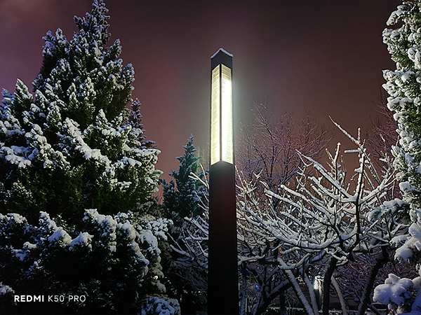 紅米從來(lái)不像某些品牌在影像算法搞太多話術(shù)來(lái)虛張聲勢(shì),但是實(shí)際的拍攝效果卻依然給我們很大的底氣。比如極佳的色彩表現(xiàn),出色的白平衡準(zhǔn)確度讓色彩的還原效果達(dá)到了賞心悅目的境地。而逆光下更為值得一提,不僅在強(qiáng)逆光環(huán)境中能夠保持通透的畫面,并且背光狀態(tài)下的細(xì)節(jié)依然絲毫畢現(xiàn)。夜拍效果也出乎我們的預(yù)料,在夜晚昏暗的場(chǎng)景中,光源的溢出抑制控制的非常不錯(cuò),并沒有因?yàn)橹醒牍庠吹膹?qiáng)烈而導(dǎo)致周圍樹木和積雪變暗,而且夜晚路燈的逆光下依然能夠呈現(xiàn)很好的效果,Redmi K50 Pro在這種極為苛刻的場(chǎng)景中依然表現(xiàn)的游刃有余實(shí)屬難得。