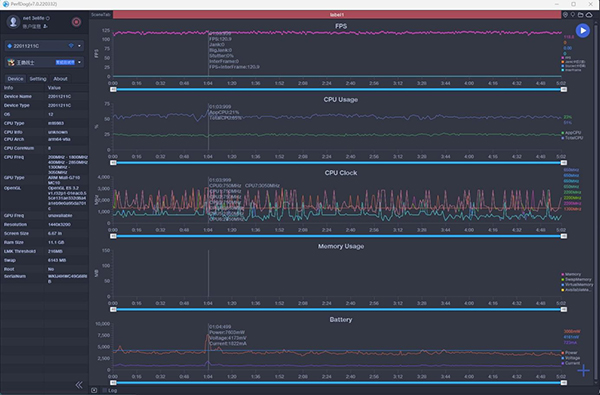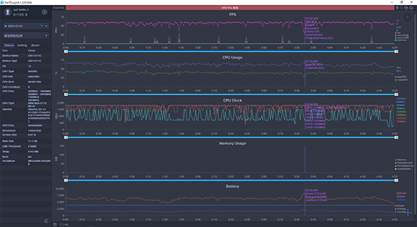 在另一款FPS游戲《王牌戰(zhàn)士》中,將游戲幀率與畫(huà)質(zhì)選項(xiàng)全部調(diào)節(jié)為最大,同時(shí)關(guān)掉所有自動(dòng)降幀的選項(xiàng)。可以看到紅米K50 Pro,不僅幀率全程穩(wěn)定在120FPS,而且除了出現(xiàn)過(guò)一次7.6W的瞬時(shí)功耗外,絕大多數(shù)時(shí)候記錄到的功耗都只有3.3W上下,而機(jī)身一直也都只是微微溫?zé)?。功耗表現(xiàn)出色的天璣9000實(shí)現(xiàn)了持續(xù)且穩(wěn)定的高性能輸出。
