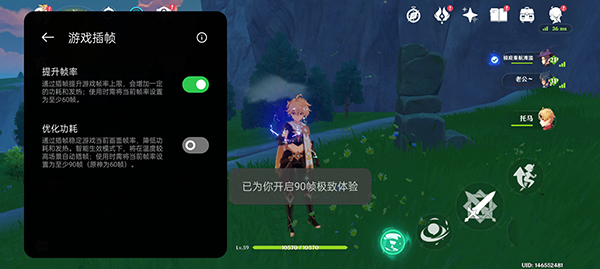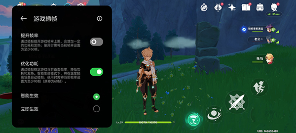 在游戲中,側(cè)滑呼出“游戲助手”,即可通過(guò)「游戲插幀」這個(gè)開(kāi)關(guān),開(kāi)啟提升幀率模式和優(yōu)化功耗模式。需要注意的是,上述兩個(gè)功能不能同時(shí)開(kāi)啟,根據(jù)游戲的不同,兩個(gè)功能適配的情況也是不同。
