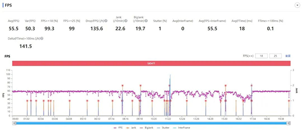 在GT模式下,未開(kāi)啟插幀時(shí),使用《原神》最高畫(huà)質(zhì)+60fps,可以看到30分鐘平均55.5fps,較大抖動(dòng)主要出現(xiàn)在重度打斗場(chǎng)面,其他跑圖、對(duì)話(huà)場(chǎng)景則可以做到流暢滿(mǎn)幀。即便在后半段手機(jī)發(fā)熱較高時(shí),也沒(méi)有出現(xiàn)鎖幀的現(xiàn)象,反而可以很快上升到一個(gè)平穩(wěn)的水平。