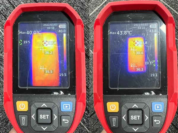 這兩個(gè)因素強(qiáng)強(qiáng)聯(lián)合,筆者在拍使用紅外熱成像儀檢測的過程中,也發(fā)現(xiàn)真我GT Neo3的散熱確實(shí)非常優(yōu)秀,機(jī)身溫度下降比較快,必須趁著游戲期間在溫度在最高時(shí)“眼疾手快”拍下來,否則等一會(huì)溫度又掉下去2~3度。