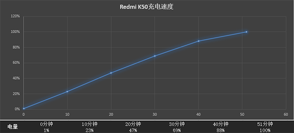 在四小時重度續(xù)航測試之后,筆者繼續(xù)使用Redmi K50直至電量耗盡自動關(guān)機(jī)。而后連接上官方充電線與充電頭,開始充電測試。數(shù)據(jù)顯示,Redmi K50用時20分鐘可充入47%電量,51分鐘完全充滿電量。對于這塊5500mAh的電池來說,充電速度已經(jīng)算是這個價位的一線水平。