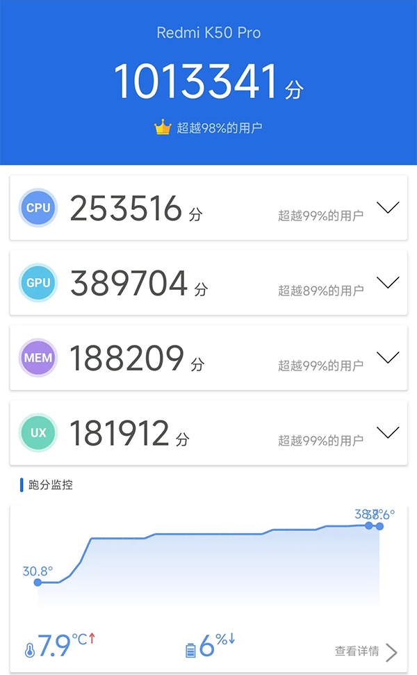我入手的Redmi K50 Pro是12GB內(nèi)存版本,安兔兔跑分為1013341分,天璣9000這顆芯片看來(lái)是真的強(qiáng),不過(guò)8GB版本跑分應(yīng)該不會(huì)突破100萬(wàn)吧?